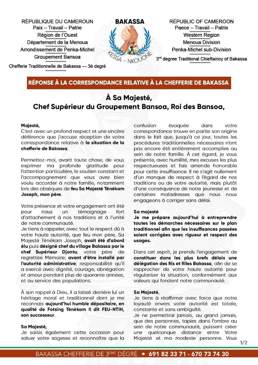 La réaction par communiqué, du Chef Supérieur Bansoa, qui a suscité la réponse du fils Tenekam