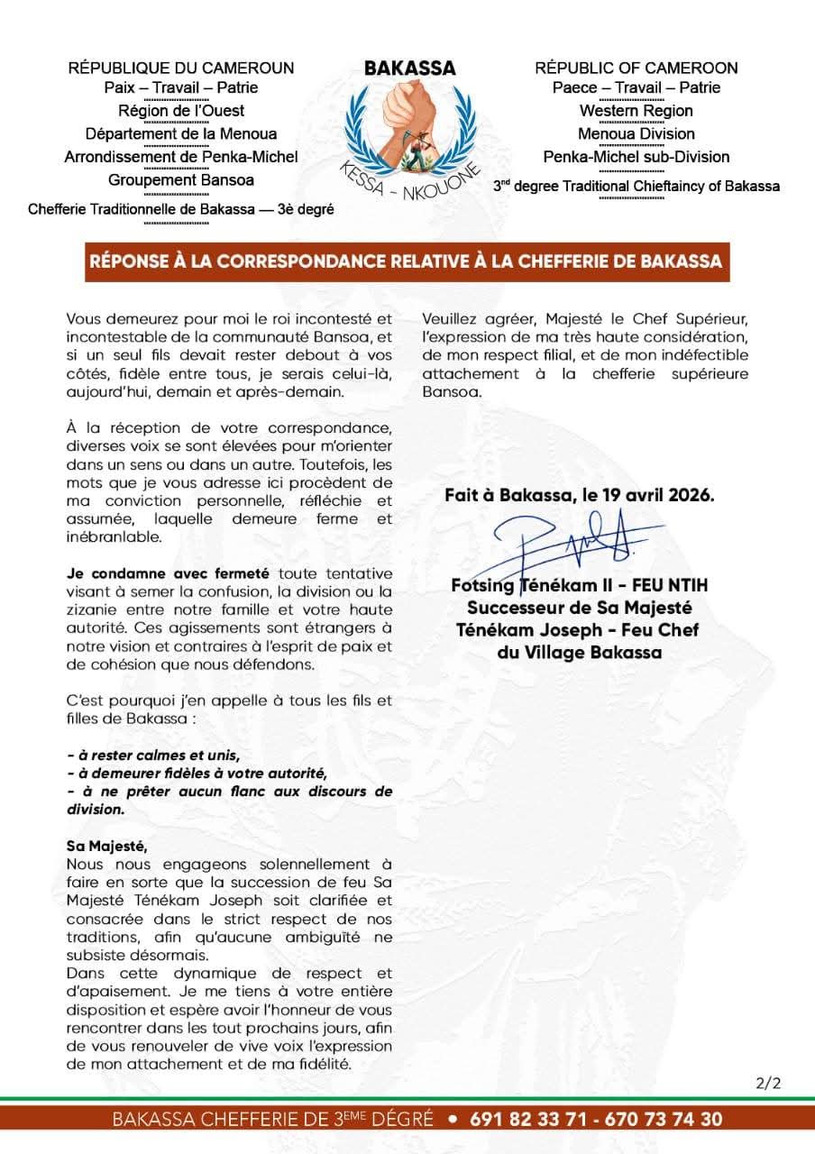 “La confusion évoquée dans votre correspondance trouve en partie son origine dans le fait que, jusqu’à ce jour, toutes les procédures traditionnelles nécessaires n’ont pas encore été entièrement accomplies au sein de notre famille. À cet égard, je vous présente, avec humilité, mes excuses les plus respectueuses et fait amende honorable pour cette insuffisance.”, peut-on lire dans le communiqué signé Firming Fotsing Tenekam II, s’adressant au chef supérieur du Gouvernement Penka-Michel.