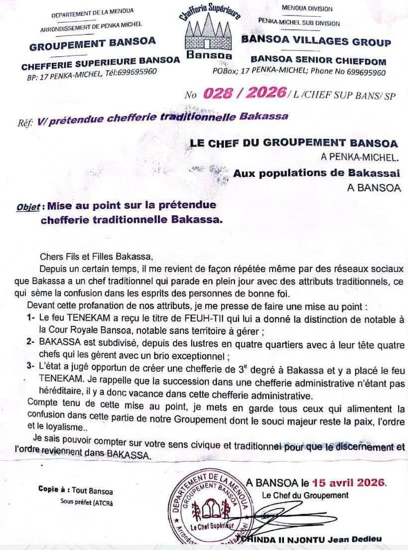 “Objet: Mise au point sur la prétendue chefferie traditionnelle Bakassa.