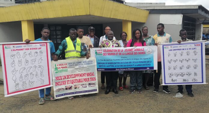 À l’occasion de la Journée Mondiale des Sourds le 26 Septembre et la Journée Mondiale de la langue des Sourd le 23 Septembre, l’association L’ŒIL et la Main, dirigée par Dimitri Fokou, enseignants de langue des Sourds à la Cafda, a effectué une activité de sensibilisation des élèves d’École Primaire, à l’école publique de Bilongue, dans l’arrondissement de Douala 3ème.